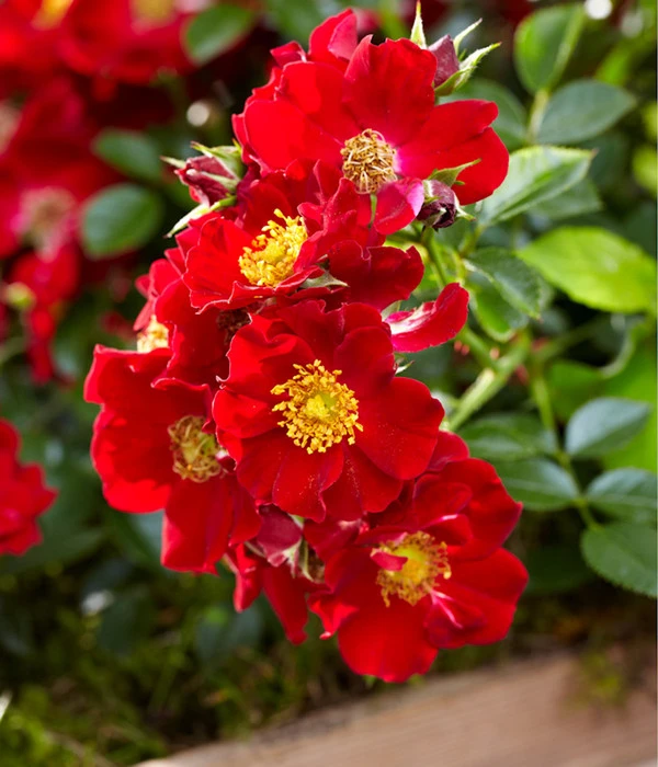 Wenn sich im Juni die dunkelroten Blütenblätter öffnen und den Blick freigeben auf die sonnengelben Staubgefäße im Blüteninneren, scheint das eine Einladung an alle Bienen, Hummeln, Schmetterlinge und Co in der Nachbarschaft zu sein, gleich einmal bei Ihnen vorbeizuschauen. Und Sie selbst werden nicht wissen, was Ihnen mehr Freude bereitet: Die emsigen Insekten beim Naschen zu beobachten oder der hohe Dekorationswert der leuchtenden Blüten. Die Beetrose ‚Bienenweide®‘ in Rot‘ ist eine besonders gelungene Züchtung aus der berühmten Rosenschule Tantau, die ihre Reize freigebig von Juni bis Oktober zur Schau stellt. Und da die intensiv leuchtenden Blüten von kräftig dunkelgrün glänzendem Laub begleitet werden und die Pflanze insgesamt einen kompakten, kissenförmigen Wuchs mit einer Höhe von 40-60 cm zeigt, sollte es für Sie nur eins geben: Sofort die Beetrose ‚Bienenweide®‘ – oder besser gleich mehrere Pflanzen davon – besorgen und sich schon bald über den prachtvollen Blütenflor freuen.