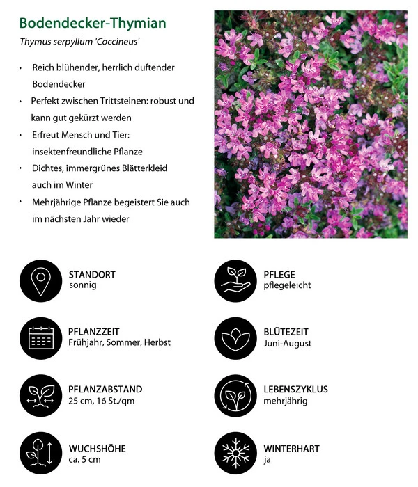 Thymian ist eine extrem anspruchslose Pflanze. Sie wächst gerne auf trockenen und sandigen Böden, kommt aber auch mit normaler Gartenerde zurecht. Wichtig ist nur, dass der Boden gut durchlässig ist, denn Staunässe bekommt der Pflanze schlecht. Wenn der Standort dann noch ausreichend sonnig ist, wird die Staude prächtig gedeihen und sie mit gesundem Wuchs und einer langen Blüte erfreuen. Die Pflanze ist winterhart und braucht keinen Winterschutz. Wir empfehlen, die Pflanze alle paar Jahre im Frühjahr zurückzuschneiden, damit sie ihren dichten Wuchs behält.
