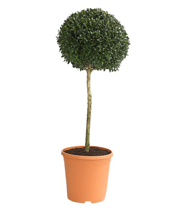 Immergrünes Laub, eine kaum nachlassende Vitalität und ein Lebensalter von mehreren hundert Jahren – kein Wunder, dass ein Buchs schon unsere Vorfahren tief beeindruckt hat. Und diese Faszination hat die Pflanze bis heute nicht eingebüßt, wie auch Ihr Interesse beweist. Auf einem kräftigen Stämmchen prangt eine prächtige, sattgrüne Kugelkrone, die Ihren Outdoor-Bereich an vielen Stellen schmücken wird. Denn dies ist eine weitere gute Eigenschaft, mit der sich ein Gewöhnlicher Buchsbaum in unser Gärtner-Herz schmeichelt: Er lässt sich auf faszinierend vielfältige Weise in die Gartengestaltung einbeziehen. Laden Sie gleich die immergrüne Kugel ein, im Beet neben der Terrasse den ganzjährig dekorativen Blickfang zu bilden. Oder brauchen Sie noch ein Highlight im Vorgarten? Sogar als formvollendeter Türsteher im Eingangsbereich macht sich ein Gewöhnlicher Buchsbaum hervorragend – vor allem, wenn er sich wie hier als Stämmchen mit kugeliger Laubkrone präsentieren darf.