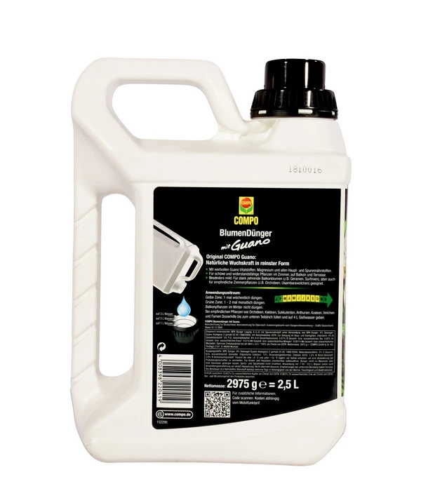 COMPO Blumendünger mit Guano ist ein hochwertiger NPK-Dünger, der Ihre Pflanzen mit den Hauptnährstoffen Stickstoff, Phosphor und Kalium, und zwar im Verhältnis 6+4+5 versorgt. Außerdem enthält der Dünger aber auch echten Guano. Dabei handelt es sich um die wertvollen Hinterlassenschaften von Millionen von Seevögeln, die als einer der besten Naturdünger gelten. Guano-Dünger stammt in erster Linie von den Seevögeln vor den Küsten und vorgelagerten Inseln Perus, die sich vorwiegend von Fischen ernähren, was ihren Kot so besonders reich an Nährstoffen macht. Deshalb ist der COMPO Blumendünger mit Guano einer besten Nährstofflieferanten für Ihre Zimmer- und Balkonpflanzen.