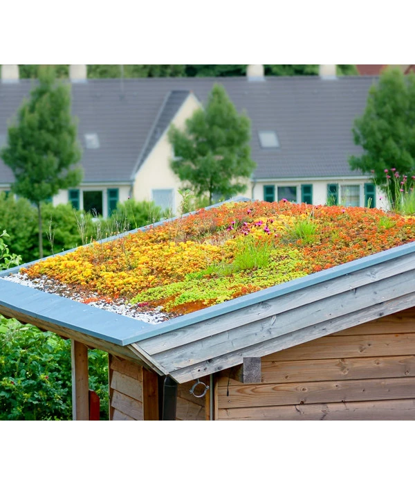 Sie haben einen Carport, einen Geräteschuppen oder eine Mülleimerbox, die Sie mit einem grünen Dach verschönern und zugleich etwas Gutes für die Umwelt tun möchten? Dann ist die Dachbegrünungsmatte mit Fetthenne genau die richtige Wahl! Auf dem handlichen Maß von 30 x 50 cm wurden bis zu 12 verschiedene Sedum-Sorten kultiviert, die alle sehr genügsam und absolut pflegeleicht sind. Durch die verschiedenen Blühzeiten bietet das begrünte Dach immer wieder einen anderen Anblick und ist gleichzeitig über den langen Zeitraum von April bis Oktober eine beliebte und wertvolle Insektenweide. Doch ein begrüntes Dach hat noch mehr Vorteile, denn es speichert Regenwasser und entlastet die Kanalisation. Setzen Sie deshalb gleich Ihren Plan in die Tat um und begrünen Sie Ihr Dach mit der Matte mit Fetthenne!