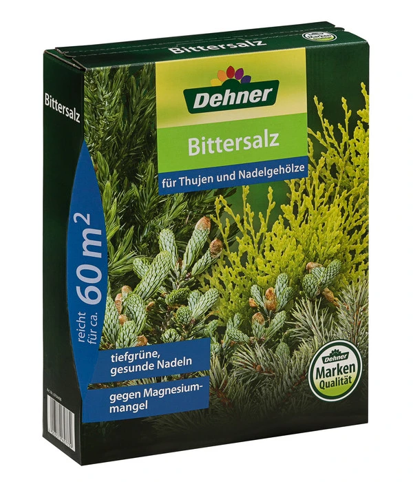 Sie wollen Ihre Nadelgehölze effektiv, aber unkompliziert vor Mangelerscheinungen schützen? Dann besorgen Sie sich das Bittersalz von Dehner. Das EG-Düngemittel mit Magnesiumsulfat bietet Ihren Thujen und Nadelgehölzen alles, damit Sie sich an ihren tiefgrünen, gesunden Nadeln erfreuen können. Zu wenig Magnesium bewirkt sonst, dass sich das Blattgrün der Nadeln aufhellt. Danach kann es braun werden, was im schlimmsten Fall zu einem Absterben der Nadeln führt. Doch mit dem Bittersalz der Marke Dehner müssen Sie sich darüber keine Sorgen machen. Schon in kürzester Zeit behebt das Mittel den Mangel und Ihre Pflanzen sehen wieder viel vitaler und gesünder aus.