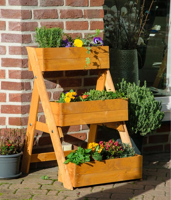 Sie würden Ihre neuen Gewächse gerne platzsparend in Ihrem Outdoorbereich anpflanzen? Dann nutzen Sie doch einfach die dekorative Holz-Pflanztreppe von dobar! Sie bietet Ihnen gleich drei Kästen, die Sie nach Lust und Laune mit Ihren Lieblingspflanzen oder Kräutern bestücken können. Ihnen stehen mit der Treppe also unzählige Gestaltungsmöglichkeiten auf kleinstem Raum offen. Platzieren Sie die hübsche Vorrichtung auf dem Balkon, auf der Terrasse oder im Garten und freuen Sie sich über ihren hochwertigen Look, der die Umgebung aufwertet.
