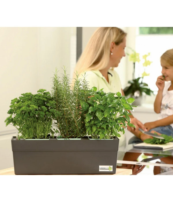 Die GREENBAR® Naschtomate wird nämlich nicht eingepflanzt, sondern einfach mit ihrem Topf in den Kasten gesetzt. Ohne dass Sie mit Erde hantieren müssen. Und ist im Herbst die Tomatensaison vorbei, nehmen Sie die abgeernteten Pflanzen heraus und stellen andere – vielleicht leckere Salat- oder Teekräuter – in den Kasten. Ohne Dreck und ohne schmutzige Hände. Dann dürfen die Kräuter auf dem Fensterbrett in der Küche Ihre Speisen bereichern. Also am besten gleich den GREENBAR®-Kasten mitbestellen.