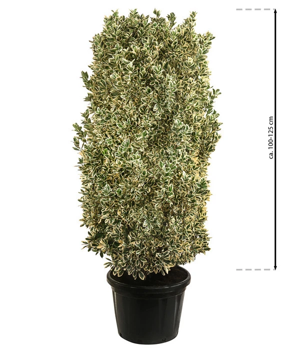 Hier sehen Sie einen Strauch, der sich nicht mit normal grünem Blattschmuck zufriedengeben wollte, sondern jedes seiner ovalen, sattgrünen Blätter zusätzlich mit einem cremeweißen Rand verziert hat, was ihm einen besonders frischen Look gibt. Zumal der Zierstrauch dank seines dicht verzweigten Wuchses hunderte dieser dekorativen Blätter zur Schau stellen kann. Und nicht bodennah, sondern schon vom ersten Tag an auf Augenhöhe mit Ihnen, denn wir bieten Ihnen den Japanischer Spindelstrauch ‘Bravo‘ in einer stattlichen Höhe von ca. 100-125 cm an. Und wenn Sie bald beobachten können, wie er mit mehreren Kollegen einen immergrünen Sichtschutz bildet oder im Beet dekorative Akzente setzt, werden auch Sie bestimmt sagen “Bravo, gut gemacht!“. Jetzt ist nur noch die Frage offen: Was darf der Japanischer Spindelstrauch ‘Bravo‘ bei Ihnen machen?