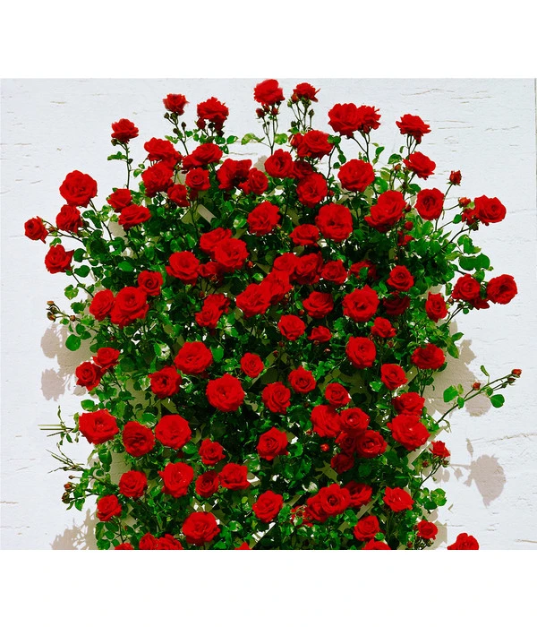 Eine in voller Blüte stehende Kletterrose ist für viele der Inbegriff von Romantik. Die Königin der Blumen klettert an Hauswänden und Pergolen bis in Höhen von 3,50 m und bedeckt mit ihrem Blütenreichtum Rosenbögen und Zäune und kann so zum weithin sichtbaren Höhepunkt der Gartengestaltung werden. Wir bieten Ihnen hier verschiedene Sorten in unterschiedlichen Farbstellungen an. Alle Pflanzen zeigen eine sehr gute Verzweigung von unten an, wachsen aufrecht und breit und bilden viele, dunkelgrüne, ledrige Blätter, die den dekorativen Hintergrund für die dicht an dicht stehenden Blüten der Klettrosen bilden. An einem guten Rosenstandort und bei fachgerechter Pflege gedeihen Kletterrosen übrigens auch in großen Pflanzkübeln prächtig, sodass sich auch Balkongärtner an ihrem Blütenflor erfreuen können.