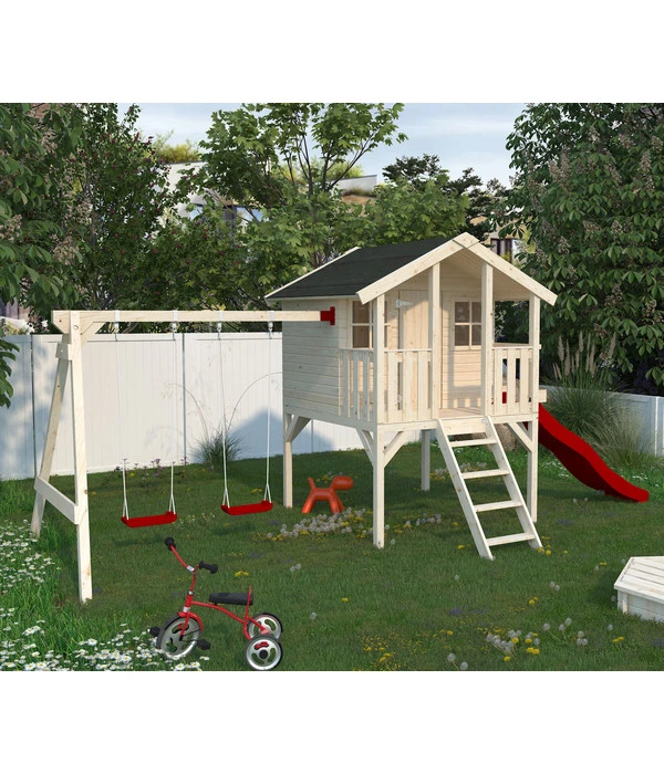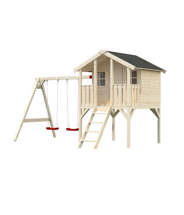 Dank der vorgefertigten Elemente lässt sich das Palmako Spielhaus Toby superleicht und unkompliziert aufbauen. Wenn es erst mal steht, wollen Sie und Ihre Kinder es bestimmt nicht mehr missen. Wie gut, dass es aus hochwertigem sowie unbehandeltem nordischen Fichtenholz hergestellt wurde. Durch diesen Werkstoff ist das Spielparadies sehr widerstandsfähig, langlebig und standfest. Sollten Sie es sich kinderleicht machen wollen, dann legen Sie doch gleich die passende Dachpappe und -schindeln mit in Ihren Einkaufskorb, wenn Sie das Palmako Spielhaus Toby inklusive Anbauschaukel jetzt zu sich nach Hause bestellen!