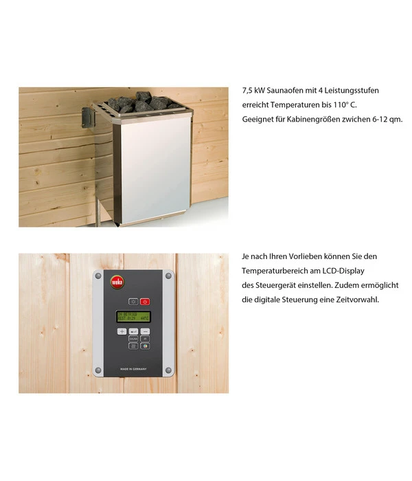 Das einfach zu bedienende Steuergerät mit Zeitvorwahl überzeugt mit seinem unauffälligen, zeitlosen Design und ermöglicht Ihnen die stufenlose Temperaturwahl von 30 °C – 110 °C – ganz wie Sie möchten. Aus Sicherheitsgründen darf die Elektroinstallation allerdings nur durch einen zertifizierten Elektrofachmann erfolgen, damit Ihre Sicherheit gewährleistet ist. Anschließend können Sie mit 4 Leistungsstufen finnisches Saunieren bis zu 110 °C genießen – und das, wann immer Sie mögen. Laden Sie schon einmal Freunde und Familie zum gemeinsamen Saunieren ein und zelebrieren Sie den skandinavischen Lebensstil!