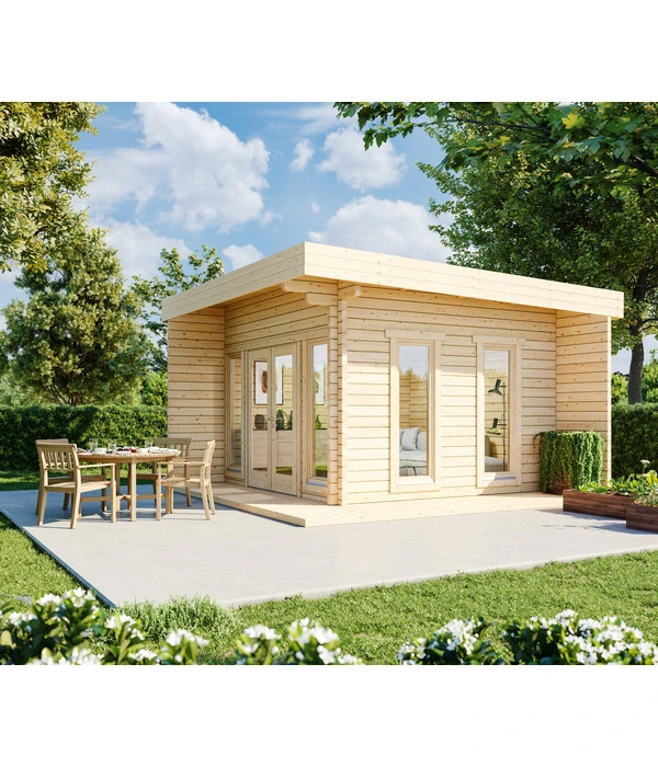 Es ist ein schöner Sonntagmorgen im Frühling, die Vögel zwitschern um die Wette und Sie gehen mit Ihrem Frühstücktablett in Ihr neues Wolff Finnhaus Gartenhaus Aalborg 70-B XL. Und während Sie gemütlich frühstücken, genießen Sie nicht nur den Blick in Ihren wunderschönen Garten, sondern auch die wunderbare Atmosphäre im Inneren des Hauses. Durch die vielen bodentiefen Fenster fällt viel Tageslicht ins Haus und Sie lassen sogar die Tür aufstehen, obwohl ein leichter Wind weht. Denn bei diesem Holzhaus sind die massivem Blockbohlenwände an zwei Seiten verlängert, so dass sie vor lästigem Wind schützen. Und vor neugierigen Blicken, weshalb Sie sich später im Liegestuhl vors Gartenhäuschen legen. Und vielleicht wird am Abend mit Freunden gegrillt. Und wenn es dann wieder kühler wird, genießen alle das besondere Flair, das das naturbelassene Holz dem Wolff Finnhaus Gartenhaus Aalborg 70-B XL verleiht. Wann beginnen Sie mit dem Aufbau Ihrer neuen Freizeit-Oase?